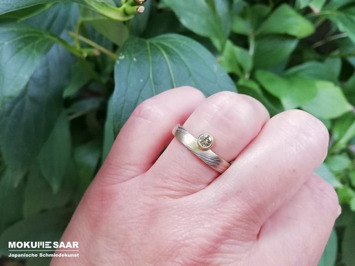 Mokume Gane Ring Nr R-11 Handarbeit, Unikat Beschreibung Vier unterschiedliche Edelmetall-Farben geben diesem schmalen Ring mit Mokume-Gane-Wellenmuster eine besondere Anziehungskraft, die Sie immer wieder aufs Neue entdecken werden. Je nach Lichteinfall verändern sich die Flächen aus Grüngold, die von Linien in dunklem Grau, kräftigem Gold und hellem Silber durchzogen sind, und zeigen jedes Mal ein anderes Farbspiel.